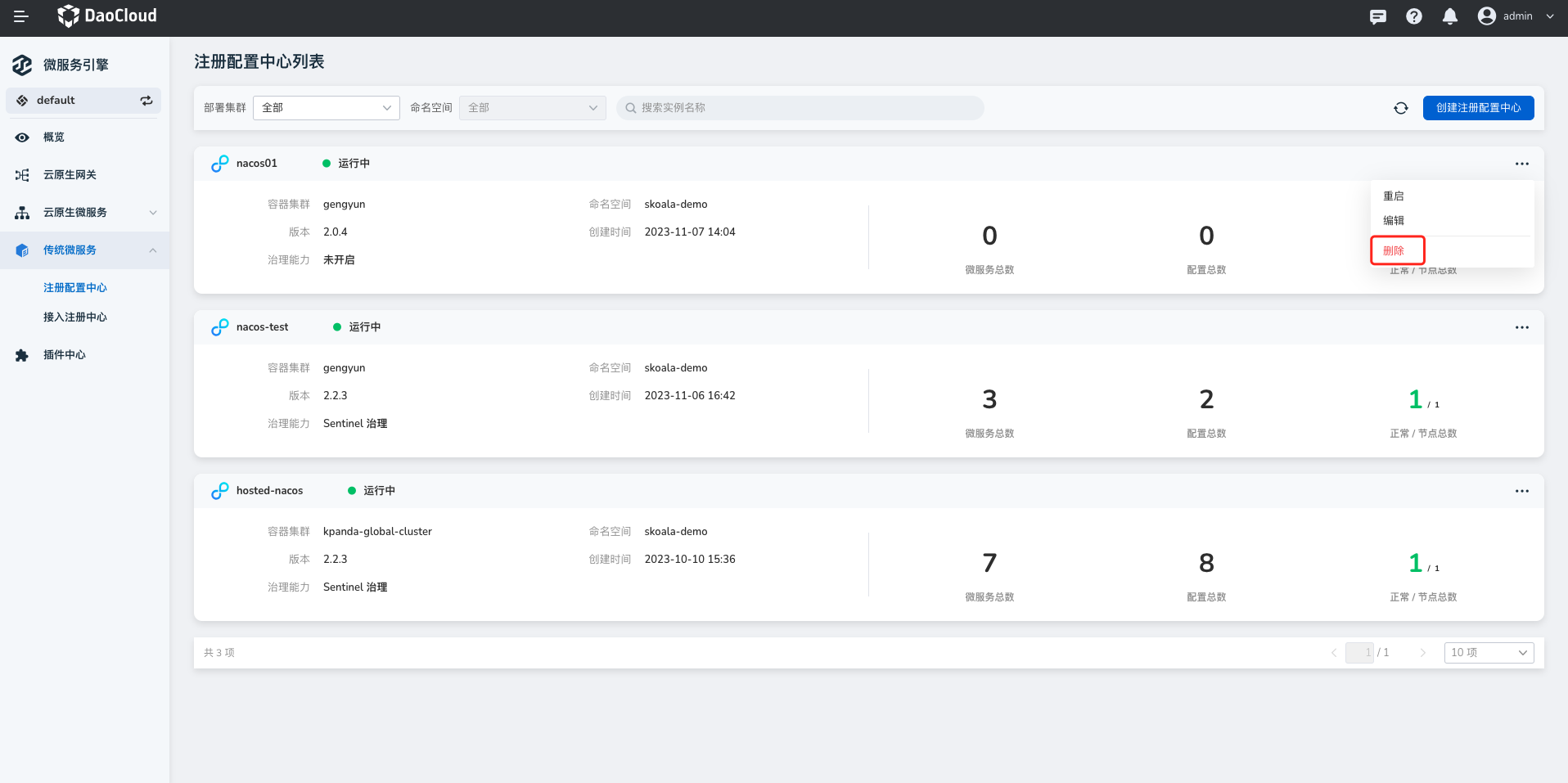 删除注册中心¶ 在托管注册中心列表页选择需要删除的注册中心,在右侧点击 ⋯ 并选择删除。 输入注册中心的名称,点击移除。 Note 接入型的注册中心仅支持移除操作,而托管型的注册中心仅支持删除操作。二者的区别在于: - 移除:只是将注册中心从 DCE 5.0 的微服务引擎中移除,不会删除原有的注册中心和数据,后续还可以再次接入该注册中心。 - 删除:删除注册中心及其中的所有数据,后续无法再次使用该注册中心,需要重新创建新的注册中心。 评论